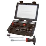 Set includes two ratcheting screwdriver handles (standard and T-handle), four interchangeable shafts (6 in. magnetic bit holder, 6 in. socket holder, 10 in. socket holder, 10 in. flex shaft bit holder), ten standard 1/4 in. drive sockets (5/32, 3/16, 7/32, 1/4, 9/32, 5/16, 11/32, 3/8, 7/16, 1/2 in.), ten metric 1/4 in. drive sockets (4, 5, 6, 7, 8, 9, 10, 11, 12, 13mm) and thirty 1/4 in. bits in holders. Bits include six slotted bits (4, 5.5, 6.5mm, 5/32, 7/32, 1/4 in.), four Philips bits (#0, #1, #2, #3), twelve Hex bits (3, 4, 5, 6, 7, 8mm, 1/8, 5/32, 3/16, 7/32, 1/4, 5/16 in.) and eight Torx bits (T8, T10, T15, T20, T25, T27, T30, T40).... |