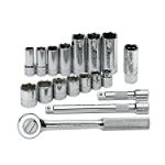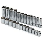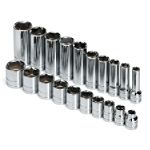 24 piece set features SK's high polish SuperKrome finish, which protects the tools from the harsh working environments found in today's workplace. Contains: 8mm, 9mm, 10mm, 11mm, 12mm, 13mm, 14mm, 15mm, 16mm, 17mm, 18mm, 19mm Standard Sockets; 8mm, 9mm, 10mm, 11mm, 12mm, 13mm, 14mm, 15mm Extra Long Deep Sockets; 16mm, 17mm, 18mm, 19mm Deep Sockets. Packaged on a rail.... |  SK 20 Pc 3/8" Drive 6 Pt Standard Deep & Extra Long Deep Fractional Socket Set | Product# 00999560000P Selling for $146.99 ()