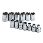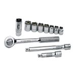 11 piece set features SK's high polish SuperKrome finish, which protects the tools from the harsh working environments found in today's workplace. Contains: 7.5" Pro Ratchet; 3", 6" Extensions; 3/8", 7/16", 1/2", 9/16", 5/8", 11/16", 3/4" Standard Sockets; 5/8" Spark Plug Socket. Packaged in a molded plastic case.... |  SK 13 Pc 3/8" Drive Fractional Palm Control Socket Set | Product# 00999570000P Selling for $138.99 ()