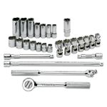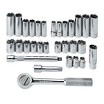 28 piece set features SK's high polish SuperKrome finish, which protects the tools from the harsh working environments found in today's workplace.Contains:7.5" Pro Ratchet; 1.5", 3" Extensions; Universal Joint; 8mm, 9mm, 10mm, 11mm, 12mm, 13mm, 14mm, 15mm, 16mm, 17mm, 18mm, 19mm Standard Sockets; 8mm, 9mm, 10mm, 11mm, 12mm, 13mm, 14mm, 15mm Extra Long Deep Sockets; 16mm, 17mm, 18mm, 19mm Deep Sockets. Packaged in a molded plastic case.... |  SK 24 Pc 1/4" Drive Semi-Deep Socket Set | Product# 00999565000P Selling for $132.99 ()