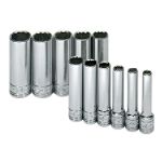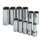 11 piece set features SK's high polish SuperKrome finish, which protects the tools from the harsh working environments found in today's workplace. Contains: 5mm, 5.5mm, 6mm, 7mm, 8mm, 9mm, 10mm, 11mm, 12mm, 13mm, 14mm, Deep Sockets. Packaged on a rail.... |  SK 11 Pc 3/8" Drive 12 Point Deep Metric Socket Set | Product# 00999589000P Selling for $89.99 ()