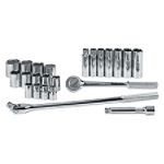 16 piece set features SK's high polish SuperKrome finish, which protects the tools from the harsh working environments found in today's workplace. Contains: 10.3" Pro Ratchet; 16" Flex Handle; 5" Extension; 7/16", 1/2", 9/16", 5/8", 11/16", 3/4", 13/16", 7/8", 15/16", 1", 1 1/16", 1 1/8", 1 1/4" Standard Sockets. Packaged in a molded plastic case.... |  SK 23 Pc 1/2" Drive 6 Point Fractional Socket Set | Product# 00999600000P Selling for $308.99 ()