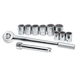 23 piece set features SK's high polish SuperKrome finish, which protects the tools from the harsh working environments found in today's workplace. Contains: 10.3" Pro Ratchet; 16" Flex Handle; 5" Extension; 7/16", 1/2", 9/16", 5/8", 11/16", 3/4", 13/16", 7/8", 15/16", 1", 1 1/16", 1 1/8", 1 1/4" Standard Sockets; 1/2", 9/16", 5/8", 11/16", 3/4", 13/16", 7/8" Deep Sockets. Packaged in a molded plastic case.... |  SK 11 Pc 3/4" Drive 12 Point Fractional Socket Set | Product# 00999602000P Selling for $410.99 ()