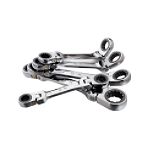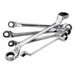 Our innovative Cross-Force design, now in a reversible ratcheting wrench. The Cross- Force puts your hand on the flat portion of the wrench for greater comfort and torque. The premium-ratcheting end offers a reversible mechanism for ease of us 5-degree swing arc offers superior access to tight spaces and a 15-degree offset box offers more knuckle clearance. Also features improved torque loading with longer than average beam length. Fully polished for easy clean-up. Includes inch sizes 3/8, 7/16, 1/2, 9/16, 5/8, 11/16, 3/4 in. and metric sizes 10, 12, 13, 14, 15, 17, and 18mm. Guaranteed Forever! Wt. 6.0 lbs. Catalog/Online Exclusive.... |