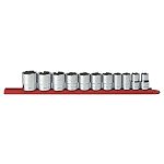Set includes the following range of sockets: 1/2", 9/16", 5/8", 11/16", 3/4", 13/16", 7/8", 15/16", 1", 1-1/16", and 1-1/8". Sockets are full polish nickel chrome plated. Large hard stamp identification. Turn down at base provides grip surface to pull sockets off ratchets. Entry angle guides fastener. Packaged on slide rail.... |