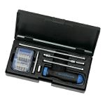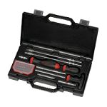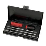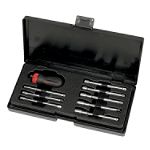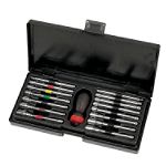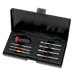 Set includes stubby ratcheting screwdriver handle and the following 1/4 inch drive magnetic bit shafts: 3 1/2 ", 6" and 10" straight shafts. 11" 180 degree Flex bit shaft. Set includes these magnetic screwdriver bits in their own bit case: #1 Phillips, #2 Phillips, #3 Phillips, 4mm slotted, 5.5mm slotted, 6.5mm slotted, T-10, T15, T20, T25 Torx bits. Organized in a plastic carrying case for easy storage and transport.... |