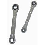 Wrench set consists of two reversible ratcheting box wrenches, with each wrench containing four fastener sizes. Set includes: 8mm x 10mm & 12mm x 13mm wrench, and 16mm x 17mm & 18mm x 19mm wrench. All wrenches sizes are accurately broached with a 12-point hex opening for a perfect no-slip fit. Wrench handles heat-treated and nickel-chrome plated for durability and a lasting appearance. Wheels are heat-treated for strength and long life, and have a black-oxide finish. Each wrench contains two reversing levers.... |