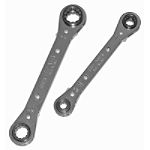 Wrench set consists of two reversible ratcheting box wrenches, with each wrench containing four fastener sizes. Set includes: 5/16 in. x 3/8 in. & 7/16 in. x 1/2 in. wrench, and 9/16 in. x 5/8 in. & 11/16 in. x 3/4 in. wrench. All wrenches sizes are accurately broached with a 12-point hex opening for a perfect no-slip fit. Wrench handles heat-treated and nickel-chrome plated for durability and a lasting appearance. Wheels are heat-treated for strength and long life, and have a black-oxide finish. Each wrench contains two reversing levers.... |
