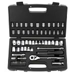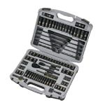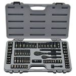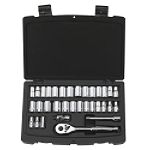 19, 1/4 MaxDrive Sockets. 16, 3/8 MaxDrive Sockets. 1, 3/8 Pear Head Ratchet Arm. 1, 1/4 Socket Driver Handle. 1, 3/8 Spark Plug Socket, 5/8. 1, 3/8 to 1/4 Adapter. 1, 3/8 Extension bar, 3, 1, 1/4 Drive Specialty Bit Holder, 9, Specialty bits, Blow Molded Case, Color Graphic Labels. Lifetime Warranty... |