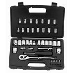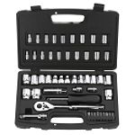 15, 1/4 MaxDrive Sockets, 14, 3/8 MaxDrive Sockets. 1, 3/8 Pear Head Ratchet Arm. 1, 1/4 Socket Driver Handle. 1, 3/8to 1/4 Adapter. 1, 3/8 Extension bar, 3. 1, 1/4 Drive Specialty Bit Holder . 6, Specialty bits. Blow Molded Case Color Graphic Labels Lifetime Warranty... |