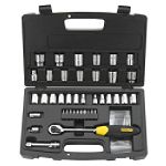 25% smaller than Stanley Round Head Ratchet, for easy access in tight work areas. 20, 1/4 MaxDrive Laser Etched Sockets. 19, 3/8 MaxDrive Laser Etched Sockets. 1, 3/8 MicroTough Ratchet with Comfort Grip. 1, 1/4 MicroTough Ratchet with Comfort Grip. 1, 1/4 Socket Driver Handle. 1, 3/8 to 1/4 Adapter. 1, 3/8 Extension bar, 3, 1, 1/4 Drive Specialty Bit Holder. 20, Specialty bits and accessories. Blow Molded Case. Color Graphic Sleeve. Lifetime Warranty... |